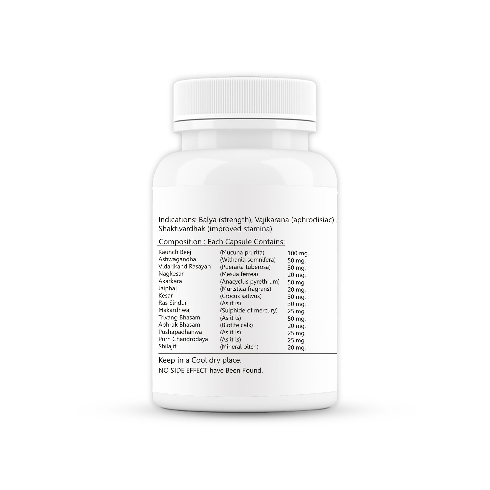 VAJRA SHAKTI contains Swarn bhasma, Kesar, Shudh Shilajit, Safed Muesli, kaunch, Ashwagandha, Gokshura, Akarakara. All are safe and natural ingredients with many studies and trials documenting their effectiveness.